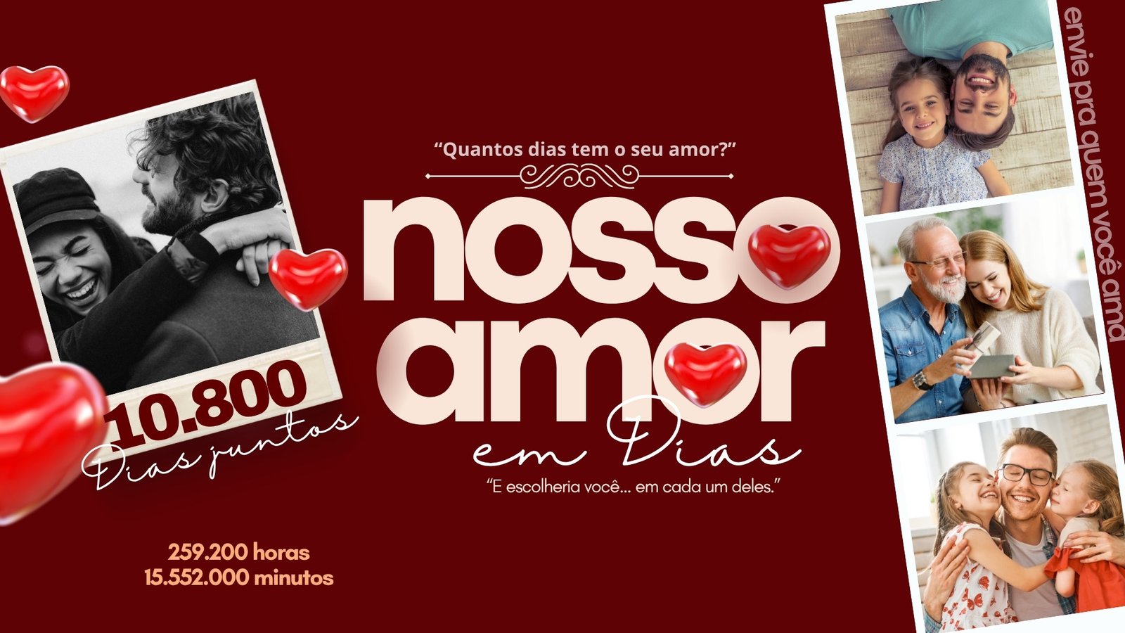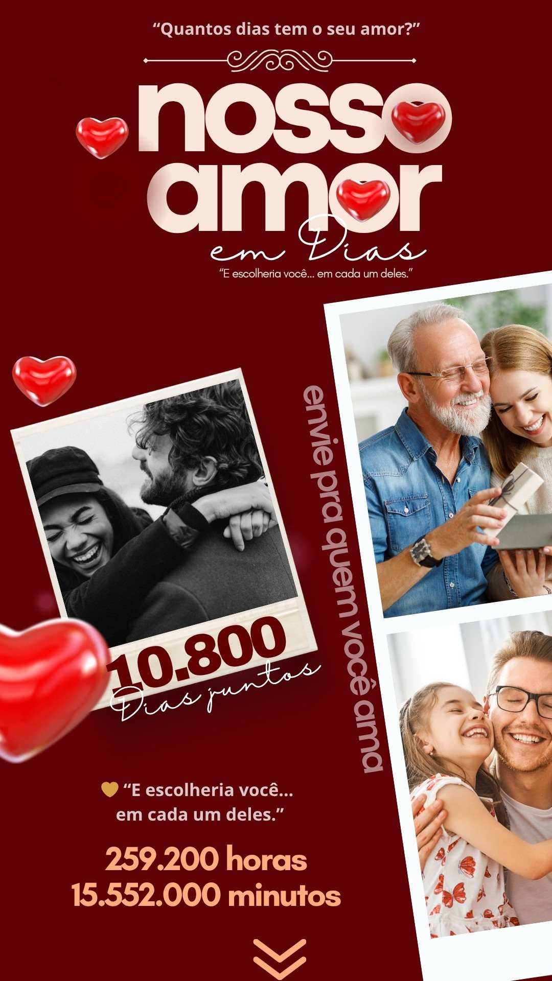 Aqui você descobre quantos dias já viveu ao lado de quem ama, e transforma isso em um cartão único e especial.